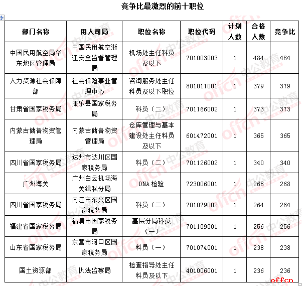 從前十名來看,排名也有一些調整,廣州海關廣州白云機場海關緝私分局DNA檢驗職位(職位代碼723006001)和國土資源部執(zhí)法監(jiān)察局檢查指導處主任科員及以下職位(職位代碼401006001)進入前十行列競爭比分別為238:1、236:1。