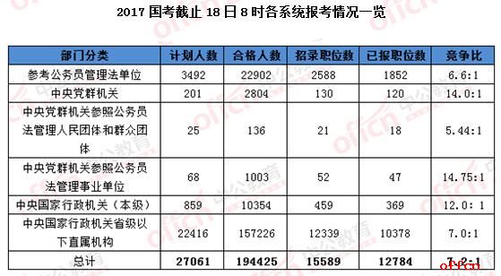 2017國考截止18日8時各系統報考情況一覽