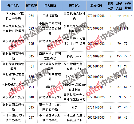 截止到10月18日8時,報名通過審核人數(shù)和競爭比例的職位為三峽海事局基層執(zhí)法大隊科員一職,招錄1人,過審人數(shù)211人,競爭比例為211:1。具體信息如下: