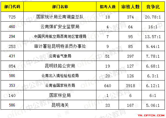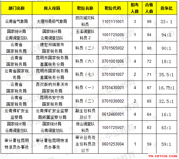 報名通過審核人數(shù)前十的職位主要集中在云南省氣象局、國家統(tǒng)計局云南調(diào)查總隊,具體信息如下: