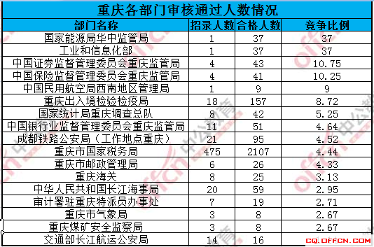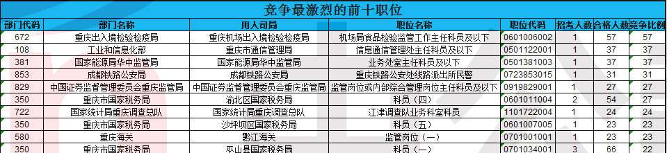 截止到18日8時,競爭比例的職位為‘重慶機(jī)場出入境檢驗檢疫局’一職,招錄1人,截止到18日8時通過人數(shù)為57人。但是還有少數(shù)崗位沒有人去報名。
