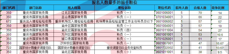 截止目前競爭最激烈的前十的職位相對前三天已經(jīng)有很大的變化,具體信息如下:
