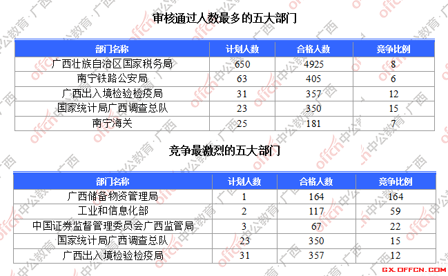 為幫助廣大考生更清晰的了解今日?qǐng)?bào)名情況,廣西中公網(wǎng)校整理了審核通過(guò)人數(shù)前五位的部門以及競(jìng)爭(zhēng)比例最激烈的五大部門,供廣大考生參考:
