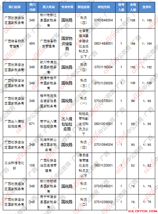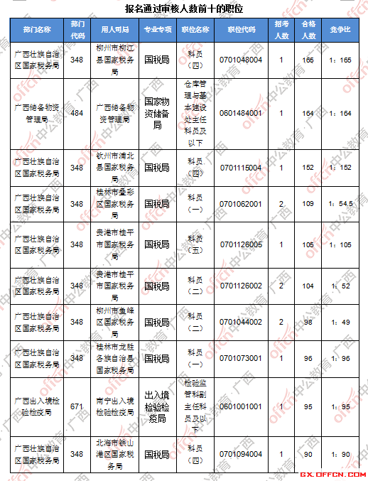 報名通過審核人數(shù)前十的職位主要集中在廣西壯族自治區(qū)國家稅務局、廣西儲備物資管理局、廣西出入境檢驗檢疫局等部門,具體信息如下: