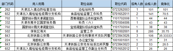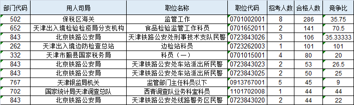 報(bào)名通過(guò)審核人數(shù)前十的職位主要集中在保稅區(qū)海關(guān)、天津出入境檢驗(yàn)檢疫局分支機(jī)構(gòu)、北京鐵路公安局,具體信息如下: