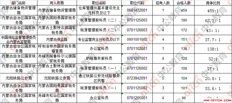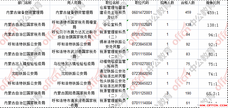 報(bào)名通過審核人數(shù)前十的職位主要集中在內(nèi)蒙古儲備物資管理局、內(nèi)蒙古固陽縣國家稅務(wù)局、內(nèi)蒙古土默特右旗國家稅務(wù)局等部門,具體信息如下:
