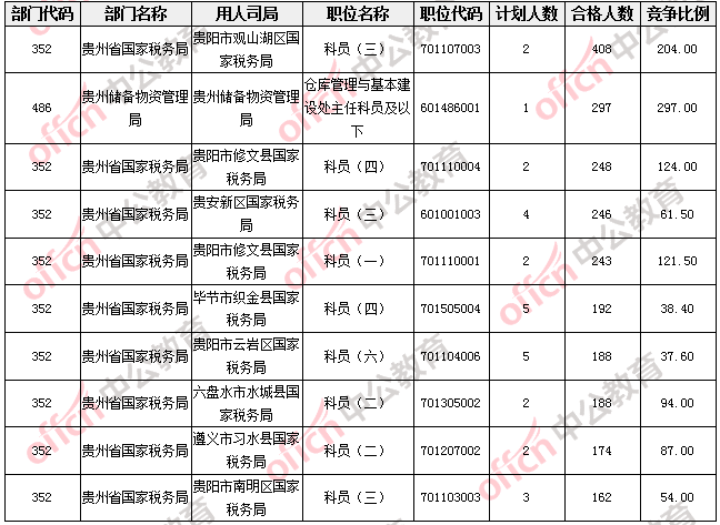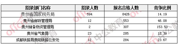 報名通過審核人數(shù)較多的職位主要集中在貴州省國家稅務(wù)局、貴州儲備物資管理局兩大部門,具體信息如下: