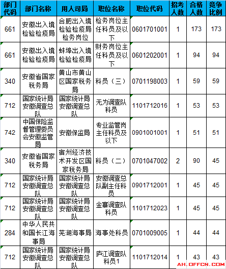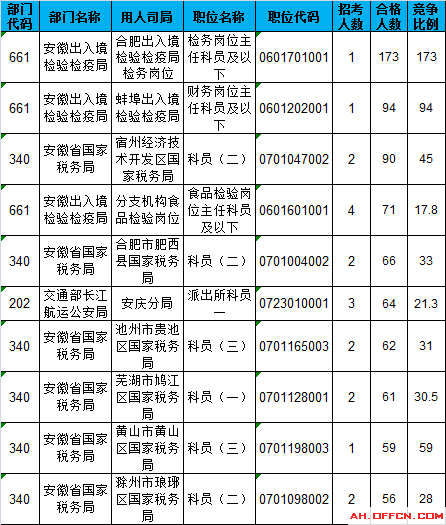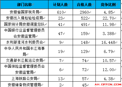 報名通過審核人數(shù)前十的職位主要集中在安徽出入境檢驗檢疫局、安徽省國家稅務局、交通部長江航運公安局這三個部門,具體信息如下: