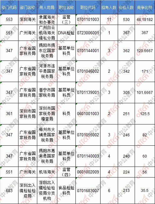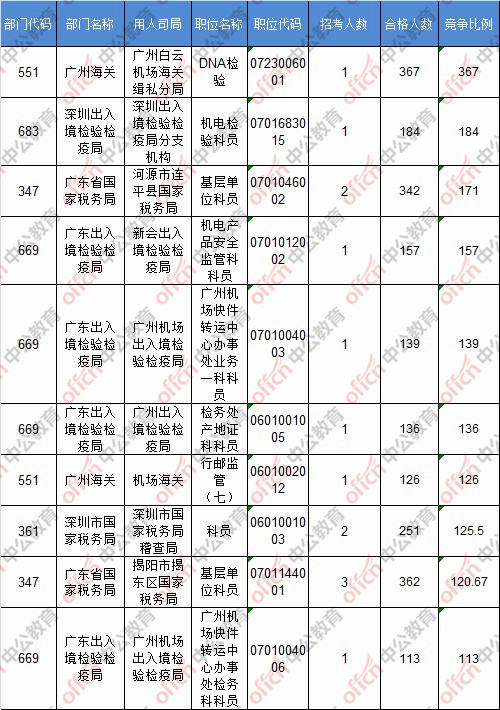 截止到18日16時,競爭比例的職位為廣州海關(guān)廣州白云機場海關(guān)緝私分局DNA檢驗一職,招錄1人,截止到18日16時通過人數(shù)為367人。