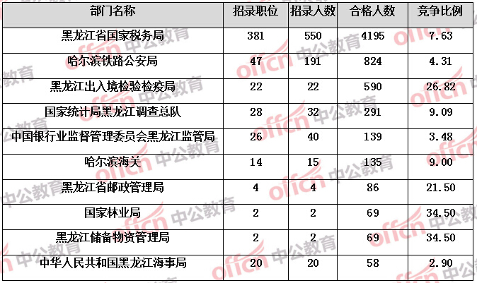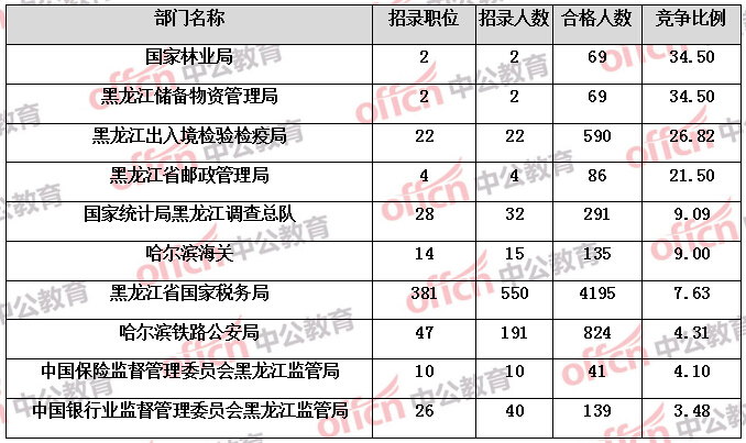 為幫助廣大考生更清晰的了解今日?qǐng)?bào)名情況,黑龍江中公教育整理了審核通過人數(shù)前六位的部門以及競(jìng)爭(zhēng)比例最激烈的十大部門,供廣大考生參考: