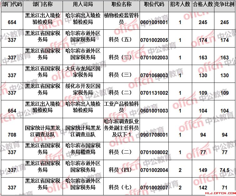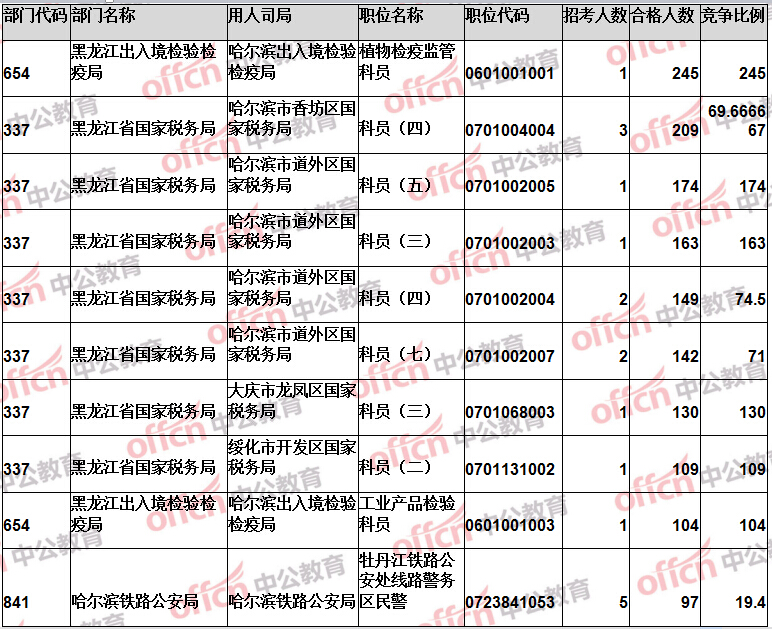 報(bào)名通過審核人數(shù)前十的職位主要集中在黑龍江省國家稅務(wù)局、黑龍江出入境檢驗(yàn)檢疫局、哈爾濱鐵路公安局等部門,具體信息如下: