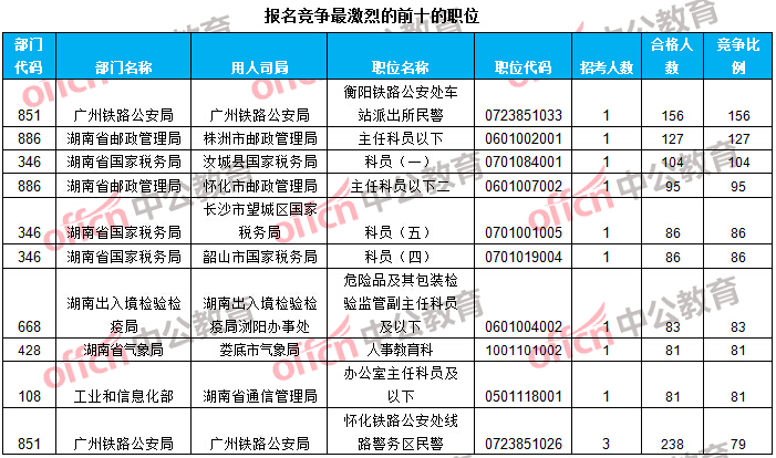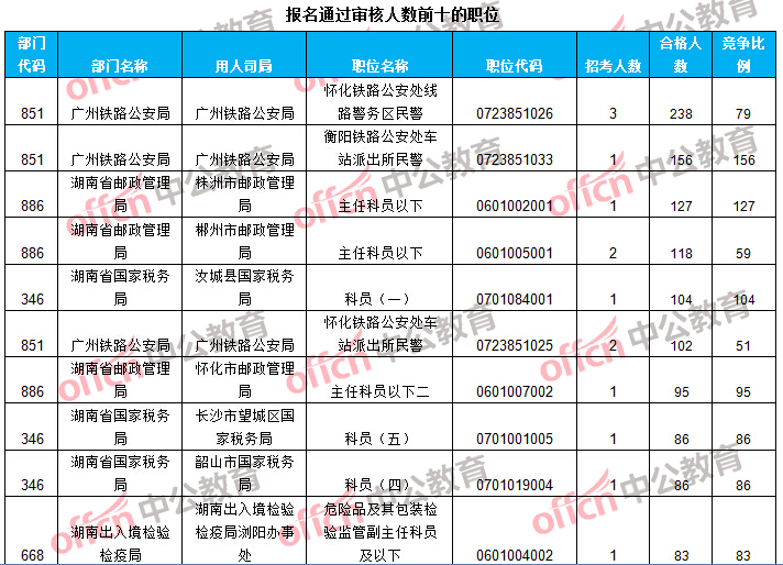 報名通過審核人數(shù)前十的職位主要集中在廣州鐵路公安局、湖南省郵政管理局和湖南省國家稅務(wù)局等部門,具體信息如下: