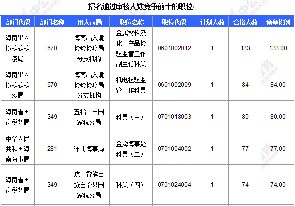 截止到18日16時,已有160個職位破0,且熱門職位人數(shù)競爭已經開始激烈,其中報名人數(shù)最多的職位為:海南出入境檢驗檢疫局,金屬材料及化工產品檢驗監(jiān)管工作副主任科員,共報名133人,競爭比例已高達133:1!