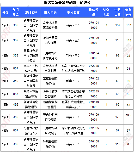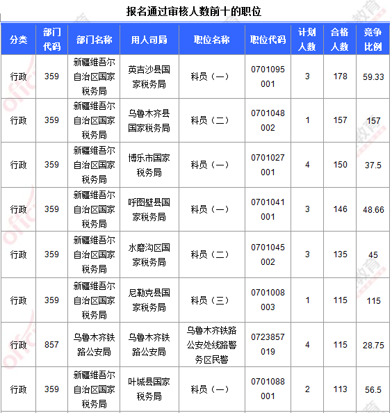 報(bào)名通過審核人數(shù)前十的職位主要集中在新疆維吾爾自治區(qū)國家稅務(wù)局、烏魯木齊鐵路公安局部門,具體信息如下: