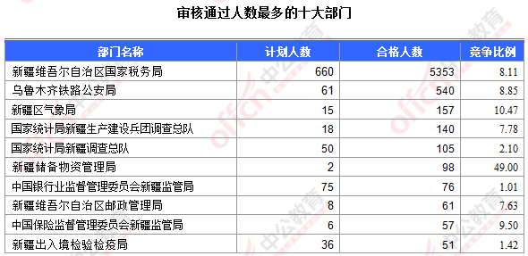 為幫助廣大考生更清晰的了解今日報(bào)名情況,新疆中公教育整理了審核通過人數(shù)前十位的部門以及競爭比例最激烈的十大部門,供廣大考生參考: