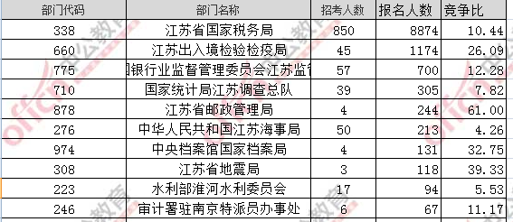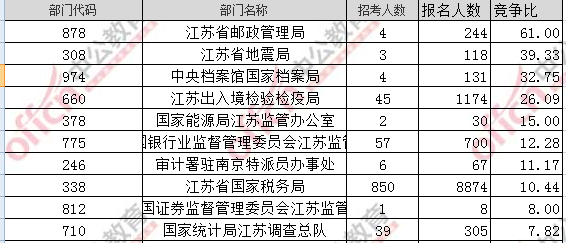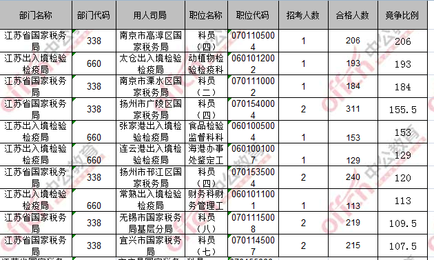 報名通過審核人數(shù)前十的職位主要集中在江蘇省國家稅務(wù)局、江蘇出入境檢驗檢疫局,具體信息如下: