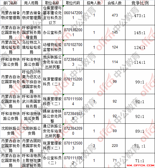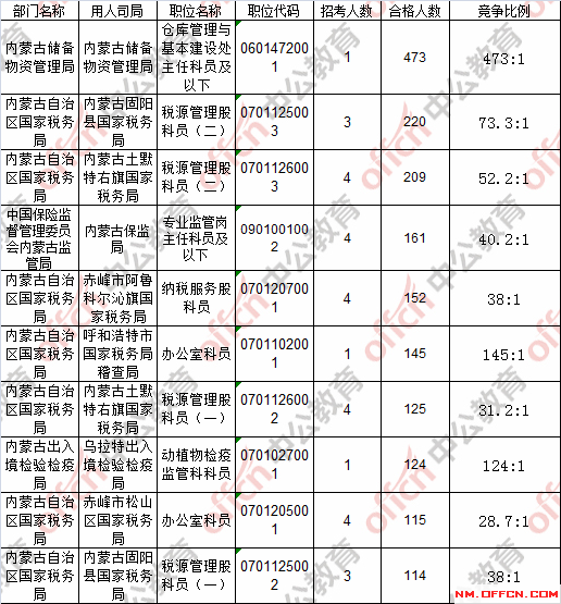報(bào)名通過(guò)審核人數(shù)前十的職位主要集中在內(nèi)蒙古儲(chǔ)備物資管理局、內(nèi)蒙古固陽(yáng)縣國(guó)家稅務(wù)局、內(nèi)蒙古土默特右旗國(guó)家稅務(wù)局等部門,具體信息如下: