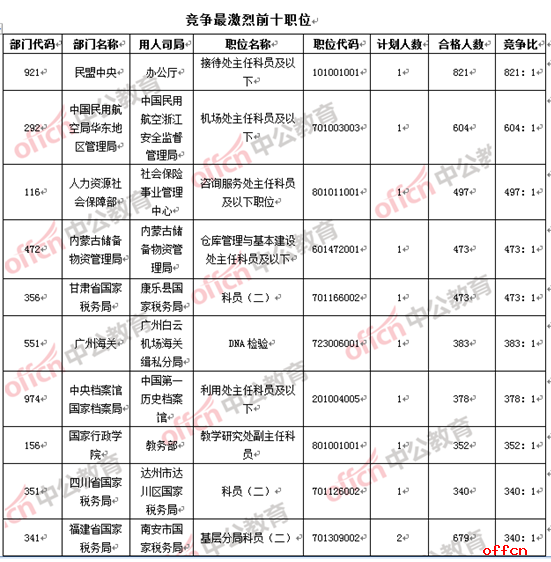 從競(jìng)爭(zhēng)比上來(lái)看,5個(gè)職位的競(jìng)爭(zhēng)比在473:1以上,除坐“頭把交椅”的民盟中央實(shí)現(xiàn)破八百大關(guān)之外,中國(guó)民用航空局華東地區(qū)管理局中國(guó)民用航空浙江安全監(jiān)督管理局機(jī)場(chǎng)處主任科員及以下(職位代碼701003003)一職的報(bào)名人數(shù)與昨日下午沒(méi)有變化,仍保持604:1的記錄,但這并不表示,此職位今后沒(méi)有新報(bào)考者的加入,很有可能是審核人員沒(méi)有對(duì)此職位進(jìn)行審核。競(jìng)爭(zhēng)最激烈排行榜中的第三名,與并列名次的第四和第五名,距離500:1的大關(guān)一步之遙,中公網(wǎng)校專家預(yù)計(jì),今日這三個(gè)職位仍會(huì)保持強(qiáng)勁前進(jìn)勢(shì)頭。
