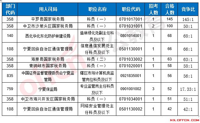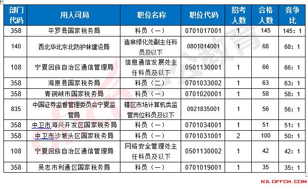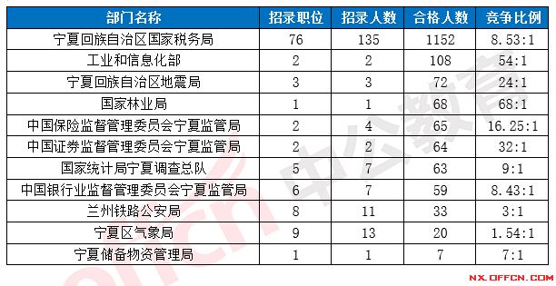 截止到19日8時(shí),寧夏國考合格人數(shù)前三位的部門依次是:寧夏回族自治區(qū)國家稅務(wù)局、工業(yè)和信息化部、寧夏回族自治區(qū)地震局。