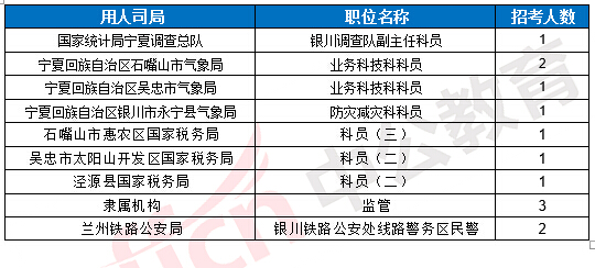 截止到19日8時(shí),工作地點(diǎn)在寧夏的職位共有9個無人報(bào)考,占全部職位的8%。下面是無人報(bào)考職位一覽表,中公網(wǎng)校專家建議廣大考生多關(guān)注一些較冷職位,避免激烈競爭,結(jié)合自身?xiàng)l件,找到屬于自己的職位。