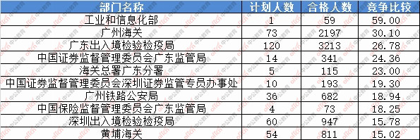 為幫助廣大考生更清晰的了解今日?qǐng)?bào)名情況,廣東中公網(wǎng)校整理了審核通過(guò)人數(shù)前十位的部門(mén)以及競(jìng)爭(zhēng)比例最激烈的十大部門(mén),供廣大考生參考: