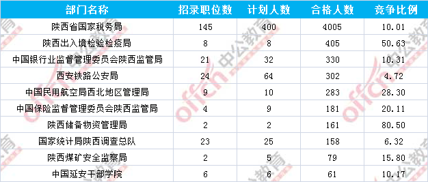 為幫助廣大考生更清晰的了解今日報(bào)名情況,陜西中公網(wǎng)校整理了審核通過人數(shù)前十位的部門以及競爭比例最激烈的十大部門,供廣大考生參考:中公網(wǎng)校