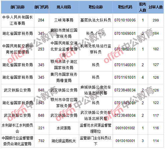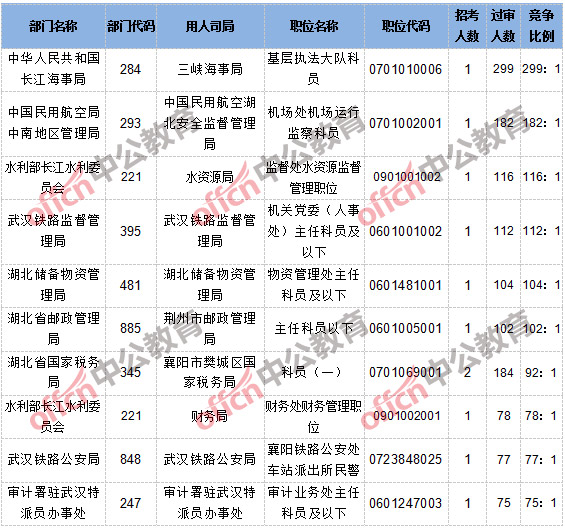 截止到10月19日8時(shí),報(bào)名通過審核人數(shù)和競(jìng)爭(zhēng)比例的職位為三峽海事局基層執(zhí)法大隊(duì)科員一職,招錄1人,過審人數(shù)299人,競(jìng)爭(zhēng)比例為299:1。具體信息如下: