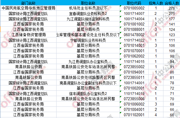報名通過審核人數(shù)前十的職位主要集中在江西省國家稅務(wù)局、國家統(tǒng)計局江西調(diào)查總隊具體信息如下: