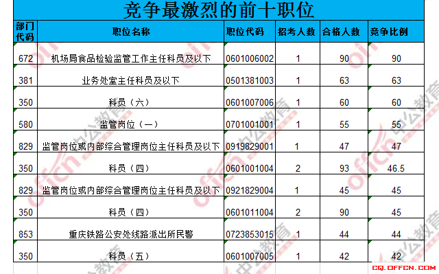 截止目前競爭最激烈的前十的職位相對前四天已經(jīng)有很大的變化,具體信息如下:
