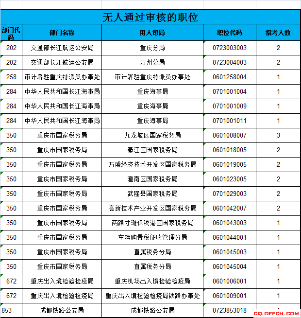 重慶無人報考的職位逐漸在減少,現(xiàn)在重慶的職位暫有19個職位無人報考,占全部職位的6%,無人報考職位如下: