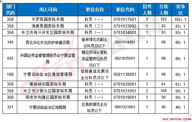 截止到19日16時(shí),寧夏國考合格人數(shù)前三位的部門依次是:寧夏回族自治區(qū)國家稅務(wù)局、寧夏回族自治區(qū)地震局、工業(yè)和信息化部,銀川海關(guān)無人報(bào)考。