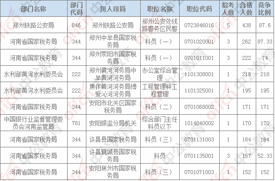 報(bào)名通過(guò)審核人數(shù)排名前列的職位主要集中在鄭州鐵路公安局、河南省國(guó)家稅務(wù)局,水利部黃河水利委員會(huì),具體信息如下: