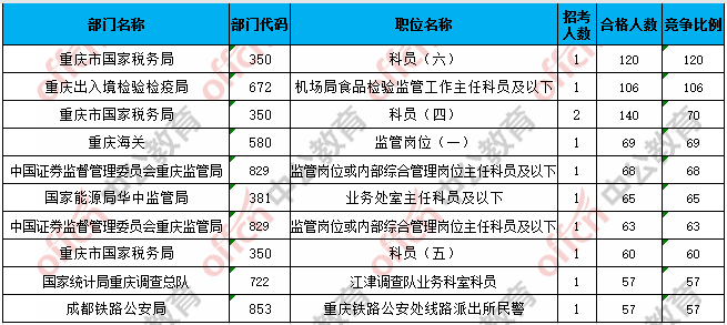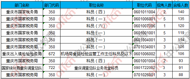 合格人數(shù)前十的職位主要集中在重慶市國家稅務局、重慶出入境檢驗檢疫局、國家統(tǒng)計局重慶調查總隊等部門,具體信息如下:
