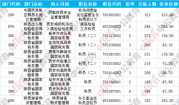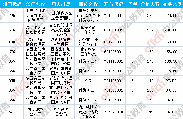 報(bào)名通過審核人數(shù)前十的職位主要集中在陜西出入境檢驗(yàn)檢疫局、陜西省國家稅務(wù)局、中國民用航空局西北地區(qū)管理局等部門,具體信息如下: