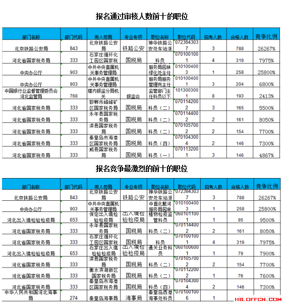 報名通過審核人數(shù)前十的職位主要集中在北京鐵路公安局、河北省國家稅務局、中央辦公廳等部門,具體信息如下: