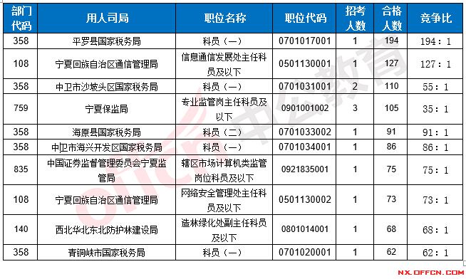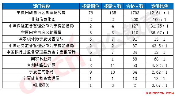 截止到20日8時,寧夏國考合格人數(shù)前三位的部門依次是:寧夏回族自治區(qū)國家稅務(wù)局、工業(yè)和信息化部、中國保險監(jiān)督管理委員會寧夏監(jiān)管局。