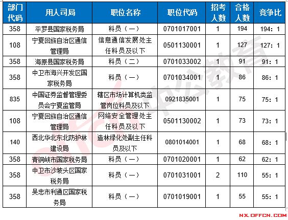 截止到20日8時,競爭比例的職位為平羅縣國家稅務(wù)局科員(一)一職,招錄1人,截止到20日8時合格人數(shù)為194人,具體信息如下: