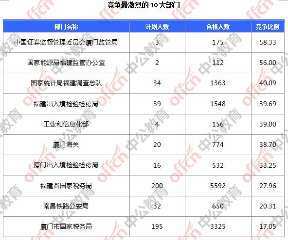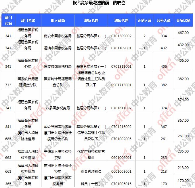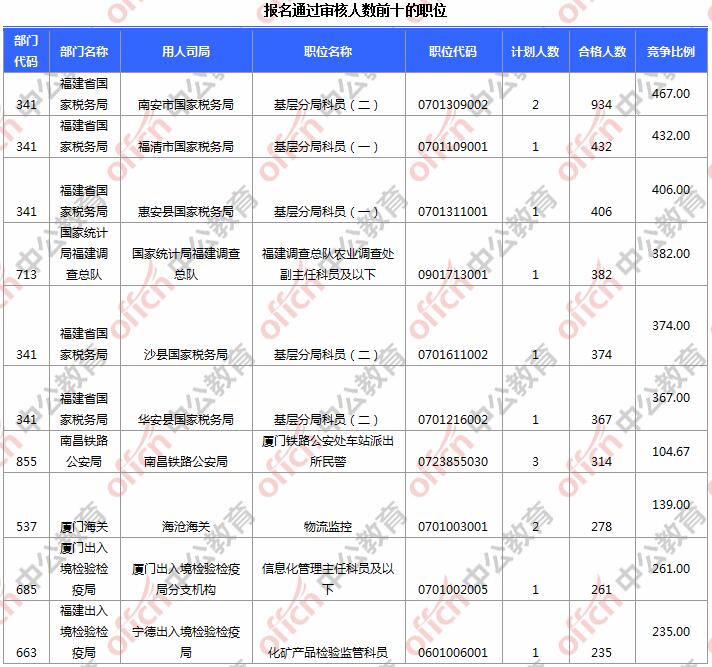 為幫助廣大考生更清晰的了解今日?qǐng)?bào)名情況,福建中公網(wǎng)校整理了審核通過人數(shù)前10位的部門以及競(jìng)爭(zhēng)比例最激烈的10大部門,供廣大考生參考: