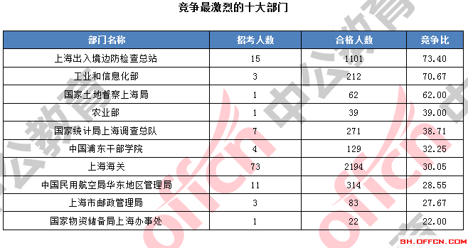 為幫助廣大考生更清晰的了解今日?qǐng)?bào)名情況,上海中公網(wǎng)校整理了審核通過(guò)人數(shù)前十位的部門(mén)以及競(jìng)爭(zhēng)比例最激烈的十大部門(mén),供廣大考生參考: