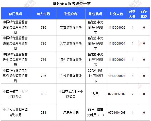 截止到20日16時,工作地點(diǎn)在海南的職位共有17個無人報考。海南中公網(wǎng)校提醒廣大考生,多關(guān)注無人報名職位,會大大降低競爭。