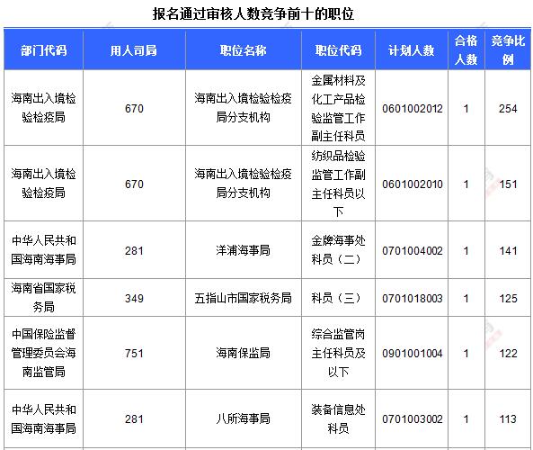 截止到20日16時,仍有17個職位無人報名,而熱門職位競爭卻是越來越激烈,其中報名人數(shù)最多的職位為:海南出入境檢驗(yàn)檢疫局,金屬材料及化工產(chǎn)品檢驗(yàn)監(jiān)管工作副主任科員,共報名254人,競爭比例已高達(dá)254:1!