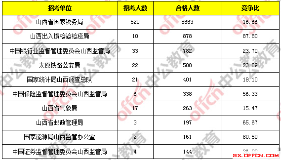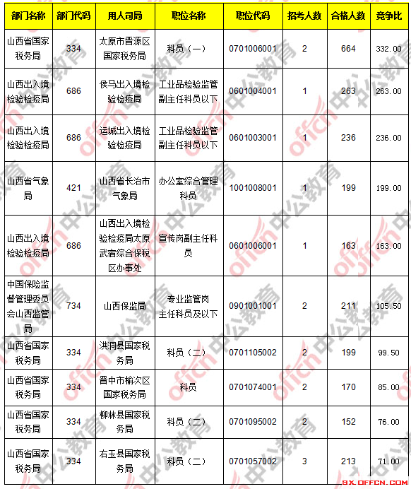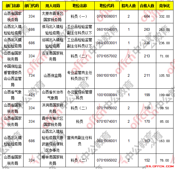 報(bào)考人數(shù)前十的職位主要集中在山西省國(guó)家稅務(wù)局、山西出入境檢驗(yàn)檢疫局這兩個(gè)部門,具體信息如下: