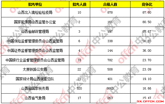 為幫助廣大考生更清晰的了解今日?qǐng)?bào)名情況,山西中公網(wǎng)校整理了合格人數(shù)前十位的部門以及競(jìng)爭(zhēng)比例最激烈的十大部門,供廣大考生參考: