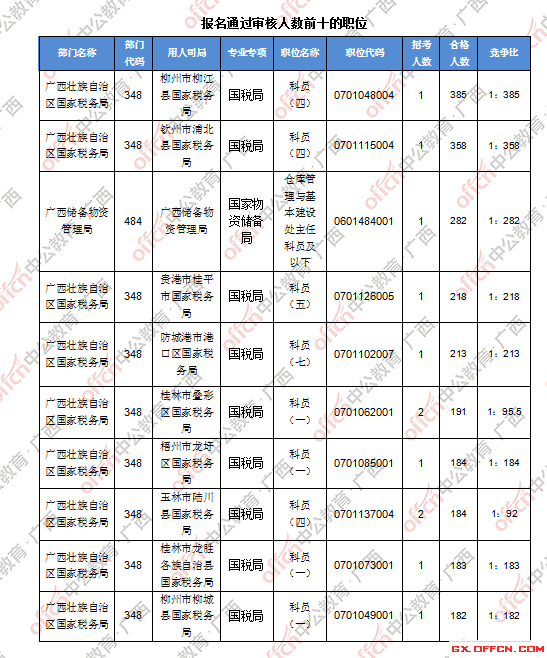 報名通過審核人數(shù)前十的職位主要集中在廣西壯族自治區(qū)國家稅務(wù)局、廣西儲備物資管理局等部門,具體信息如下: