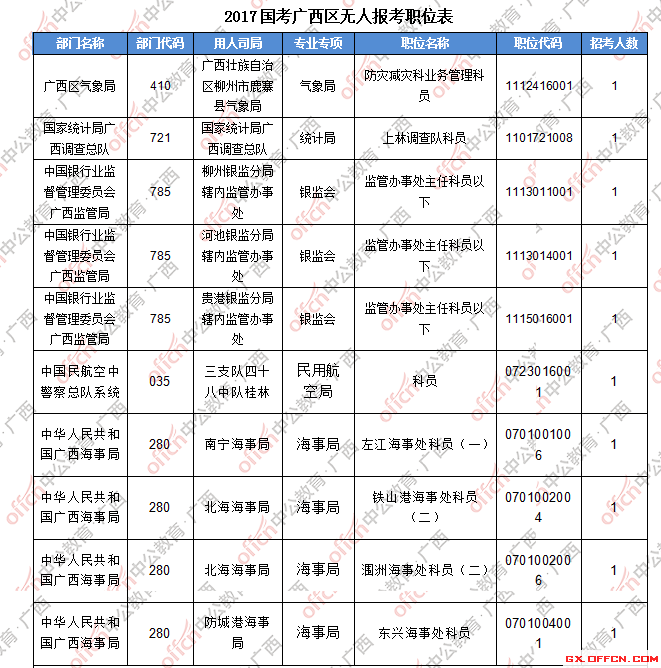 截止到20日16時,工作地點在廣西的職位共有30個無人報考,占全部職位的4.7%。下面是部分廣西無人報考職位一覽表,更多無人報考職位詳情請下載附件,廣西中公網(wǎng)校專家建議廣大考生結(jié)合自身條件,根據(jù)自己的實際情況找到屬于自己的職位,避免激烈競爭。