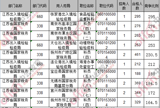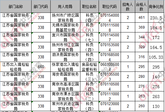 報(bào)名通過審核人數(shù)前十的職位主要集中在江蘇省國(guó)家稅務(wù)局、江蘇出入境檢驗(yàn)檢疫局,具體信息如下: