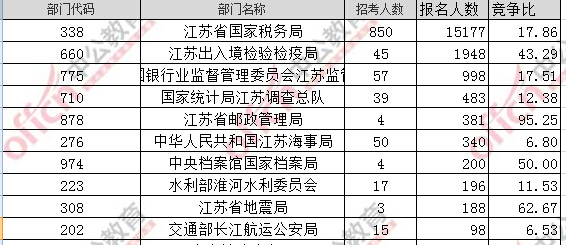 為幫助廣大考生更清晰的了解今日?qǐng)?bào)名情況,江蘇中公網(wǎng)校整理了審核通過人數(shù)前十位的部門以及競(jìng)爭(zhēng)比例最激烈的十大部門,供廣大考生參考: