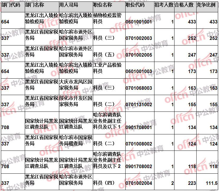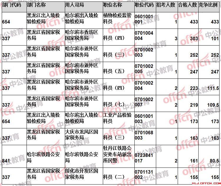 報名通過審核人數(shù)前十的職位主要集中在黑龍江省國家稅務局、黑龍江出入境檢驗檢疫局、哈爾濱鐵路公安局等部門,具體信息如下: