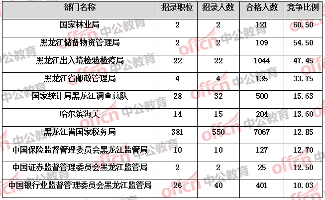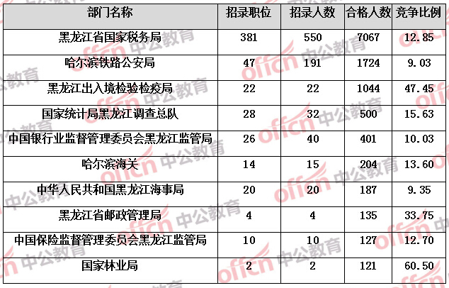 為幫助廣大考生更清晰的了解今日報名情況,黑龍江中公網(wǎng)校整理了審核通過人數(shù)前六位的部門以及競爭比例最激烈的十大部門,供廣大考生參考: