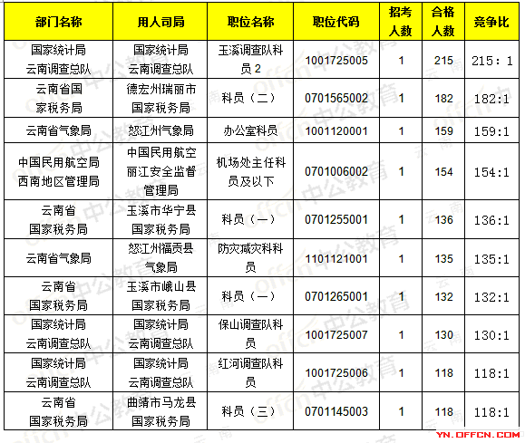 截止20日16時(shí),競(jìng)爭(zhēng)最激烈的職位為國(guó)家統(tǒng)計(jì)局云南調(diào)查總隊(duì)_國(guó)家統(tǒng)計(jì)局云南調(diào)查總隊(duì)(玉溪調(diào)查隊(duì)科員2),職位代碼1001725005,招錄1人,通過(guò)人數(shù)為215人,215:1。